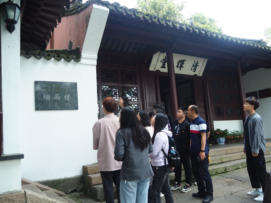 支部同学们乘坐小船来到了湖心岛,首先参观了中国共产党第一次全国代表大会会址之一——烟雨楼。中共一大刚转移至嘉兴南湖之时,11名代表先登上了南湖的烟雨楼,以观赏风景为名勘察周围情况,确定安全后才登上了事先租定的画舫游船。