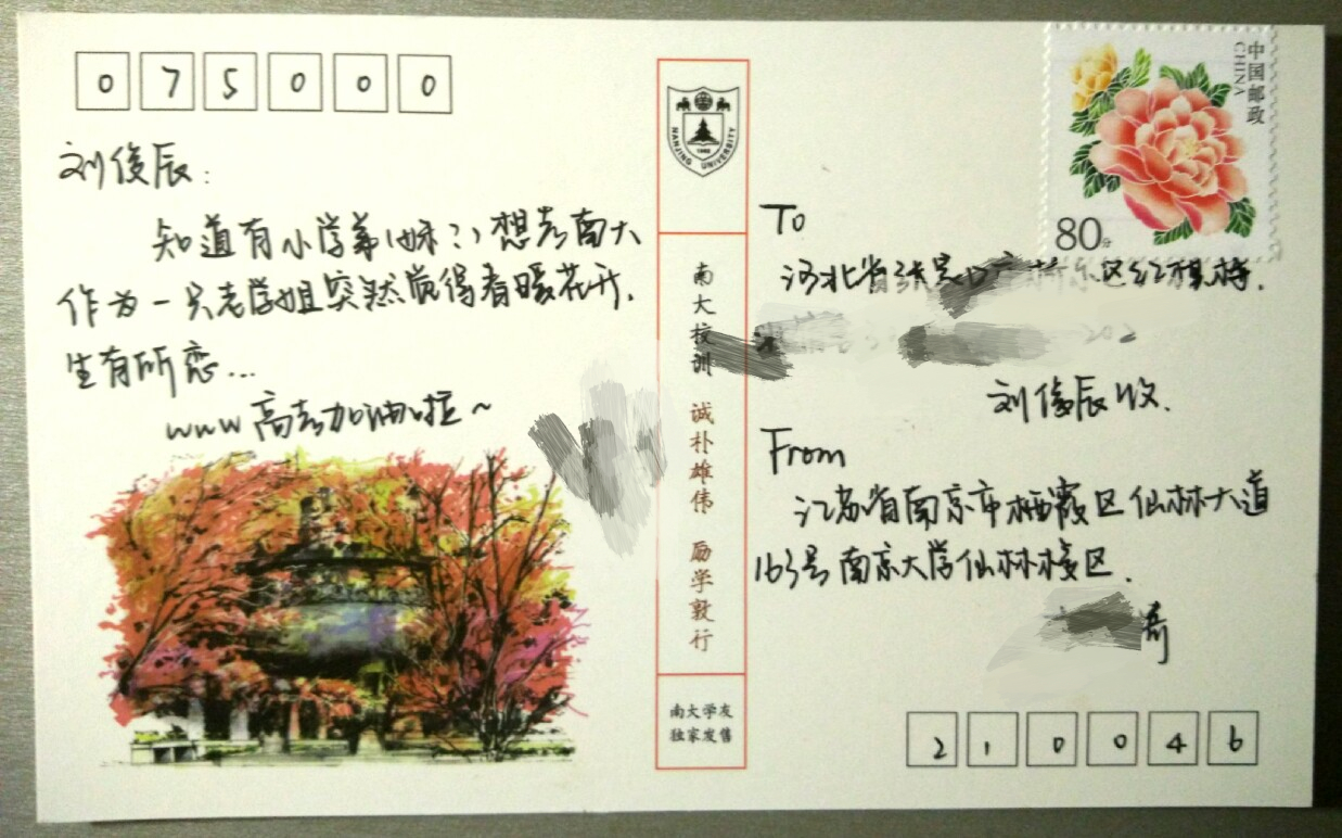 到征集日期截止时,帖子已经被顶到了近300层楼,拥有回复800余条,一度成为南大“热帖”。经统计,我们收到来自全国25个省市自治区170多位初高中同学和7位有志于报考南大研究生的学长学姐的心愿。数量之大,超出了所有活动举办同学的预期,但是,为了不让每一个南大梦留下遗憾,在结束统计工作后,全年级同学迅速积极响应,满怀热血投入到明信片的构写中。5月中旬,近180份明信片已全部从枫林网 仙林校区启程,奔赴全国各地,它们携带着85位诚恳真心的同学诚挚衷心的鼓励和祝福去往远方。
