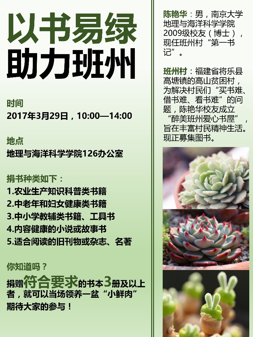 3月29日,地理学院举行了“以书易‘绿’ 助力班州”捐书活动。本次活动由毕业班同学发起,号召全院师生为福建省班州村(贫困村)村民捐赠书籍,以解决农村村民买书难、借书难、看书难问题。活动从着手准备之时就获得全院师生的热切关注和积极响应。