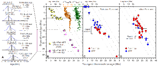 图 3. 深海沉积物样品的磷灰石裂变径迹年龄分布。裂变径迹年龄显示,磷灰石冷却到沉积在阿拉伯海,其滞后时间大约为3-6 百万年。指示相对稳定的剥蚀速率。
