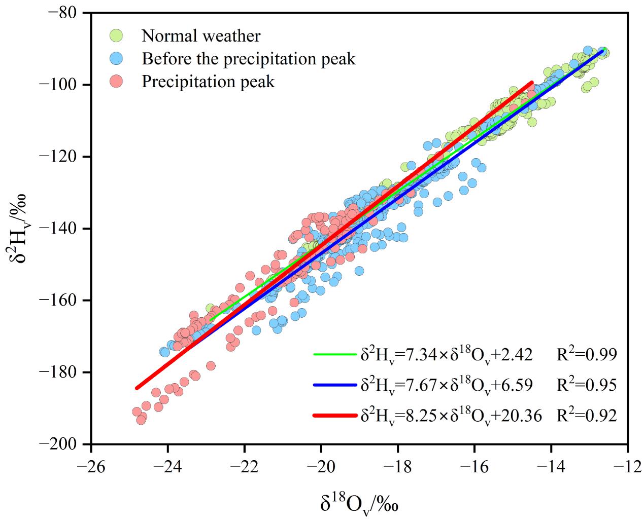 图6 正常天气、暴雨期间第一个降水峰值前和降水峰值时的大气水汽同位素水线斜率变化