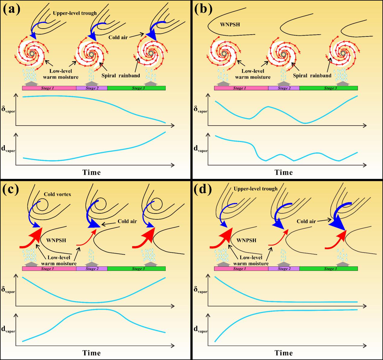 图4 不同天气系统及其相互作用和水汽稳定同位素演化示意图