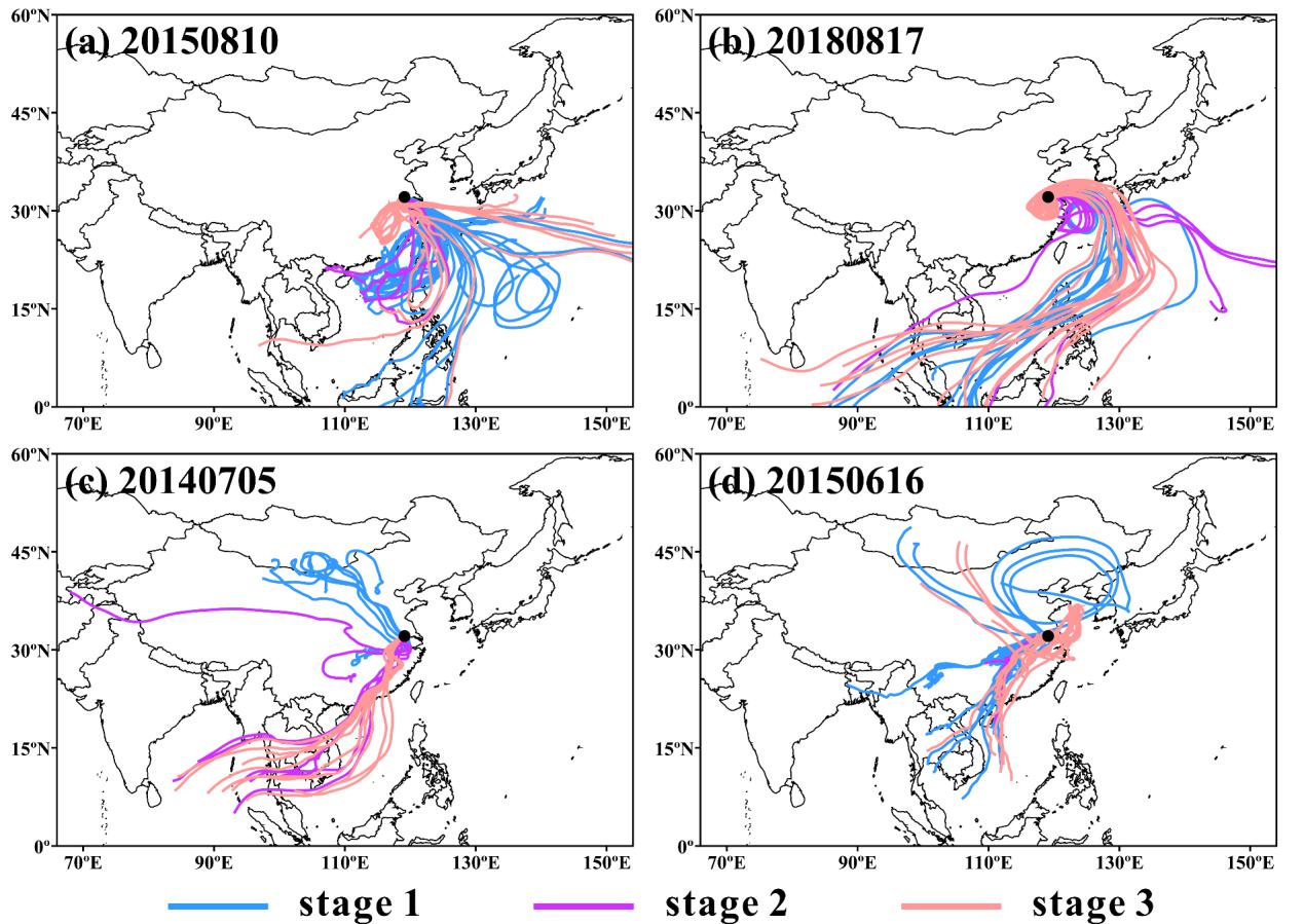 图2 暴雨事件168小时后向轨迹模拟结果
