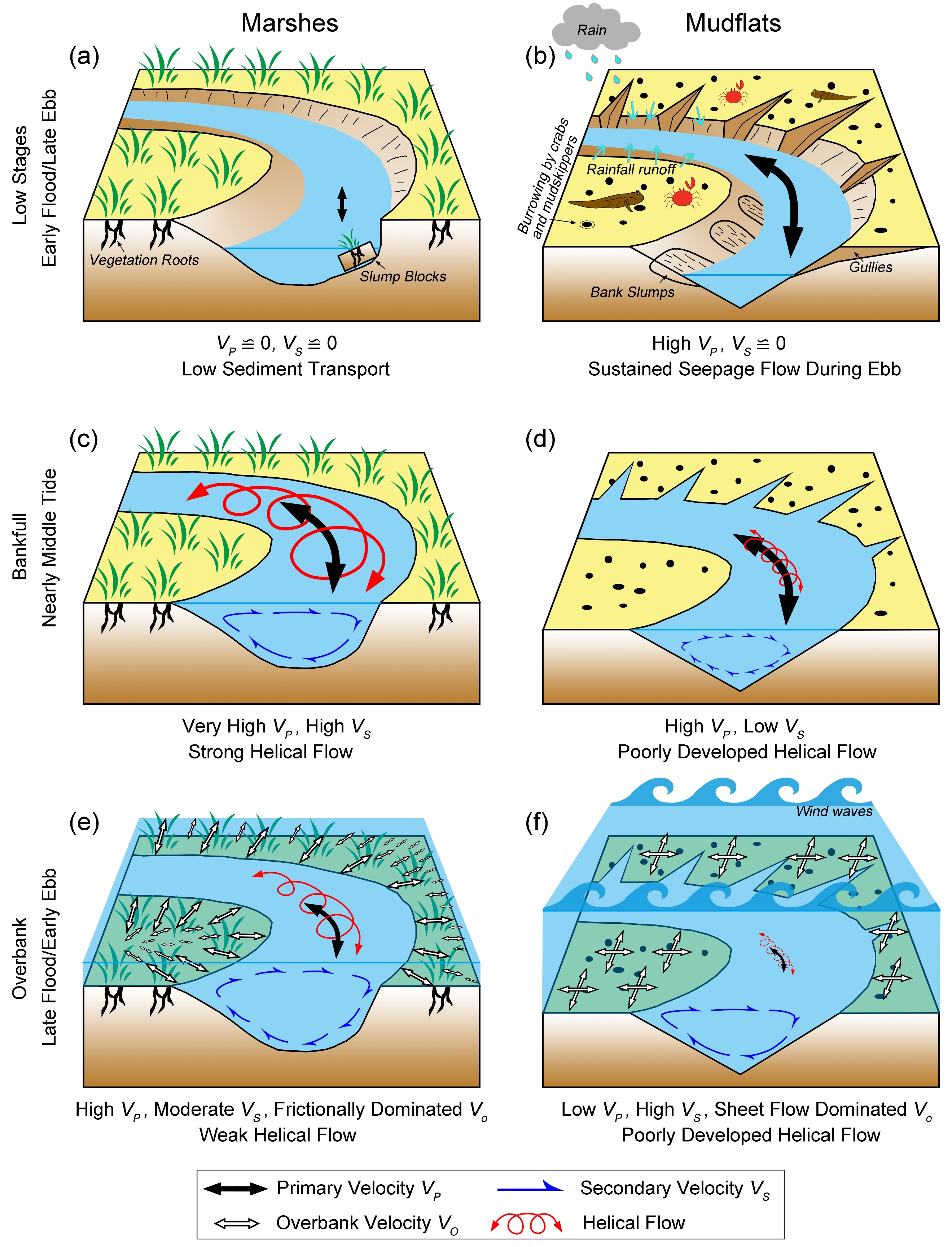 研究还进一步发现,当潮流被限制在光滩潮沟以内时,流速较为持续恒定,而当水位超过沟岸时流速迅速减小。然而,曲率诱导的横向环流却在漫滩时期更为显著。与经典的河曲横向环流理论不同,本研究发现光滩潮沟的主流速与侧向流速之间存在一个相位差甚至反相位,即当增大时减小,而当增大时减小;这限制了横向环流的发育并阻碍了螺旋流沿潮沟河曲弯道的传播。因此,我们认为光滩潮沟河曲的地貌演化并不像盐沼潮沟河曲或冲积平原上的弯曲河流一样依赖于曲率诱导的螺旋流,而主要受落潮末期持续的高流速、渗流作用以及其他非潮汐过程(如波浪和强降水)的影响,其中光滩潮沟的“V”型剖面与两岸的坍塌与冲沟等均是重要的佐证(图3)。