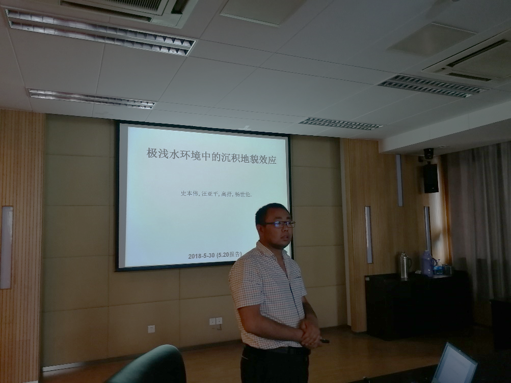 5月30日下午,葛晨东教授主持会议,枫林网 九位师生作如下报告:侯书贵教授报告了“基于一个样品的一个数据结果发表SCI一区论文的历程”,介绍了崇测冰芯的采样、实验室数据分析工作及论文发表历程。庞洪喜教授报告了“南极Dome A雪冰稳定同位素研究”,探讨了夏季升华过程对极地内陆雪冰稳定同位素的影响,平流层水汽入侵Dome A雪冰过量氧-17的影响问题。高建华副教授报告了“人类活动影响下,长江-东海源汇传输体系的阻断及系统状态的快速转换”,介绍了长江流域冲淤状态变化情况、河口陆架沉积体系对流域变化的响应及人类活动影响下,长江-东海源汇传输体系的快速转换,提出陆海统筹、大尺度宏观格局的重要性。于谦副教授报告了“沉积物粘性与泥质含量和中值粒径的关系:荷兰、中国、美国海岸样品的大数据统计”,将15个海岸研究区域划分为三大类型。史本伟博士报告了“极浅水环境中的沉积地貌效应”,通过阐述极浅水阶段的侵蚀淤积对整个潮周期内的沉积效应的影响和对波纹形成、消亡的影响,强调研究极浅水阶段沉积动力过程的重要性。徐仪红博士报告了“人工放射性钚同位素在环境示踪中的应用”,介绍了环境中Pu同位素的来源与分布、示踪优势、分析方法,并结合实例证明了Pu同位素在土壤侵蚀示踪和海洋沉积定年方面的应用价值。徐尧博士报告了“南海台风浪的观测与模拟”,通过对比南海浮标观测数据和数值模拟结果,探究非线性波-波相互作用项对海浪谱结构、能量收入的影响。硕士生王黎报告了“九章环礁水下暗礁脊槽地貌分布与形态”,将遥感影像和多波束测量结合,反演九章环礁水下暗礁脊槽地貌并分析其成因;硕士生胡心迪报告了“南沙北部道明及郑和群礁浅层地震剖面与地貌”,根据浅层地震剖面探测结果,分析了道明群礁及郑和群礁水下阶地、礁坪及潟湖水深等形态特征。