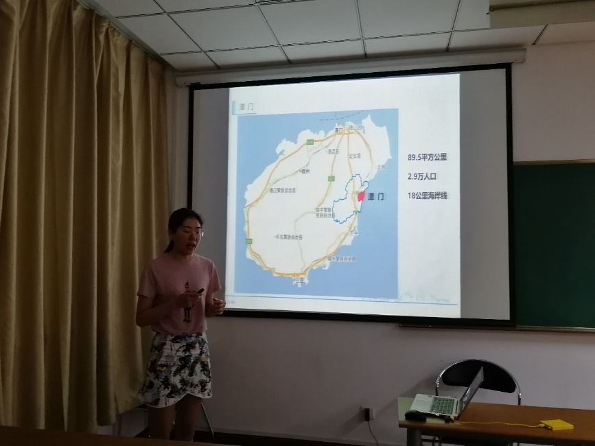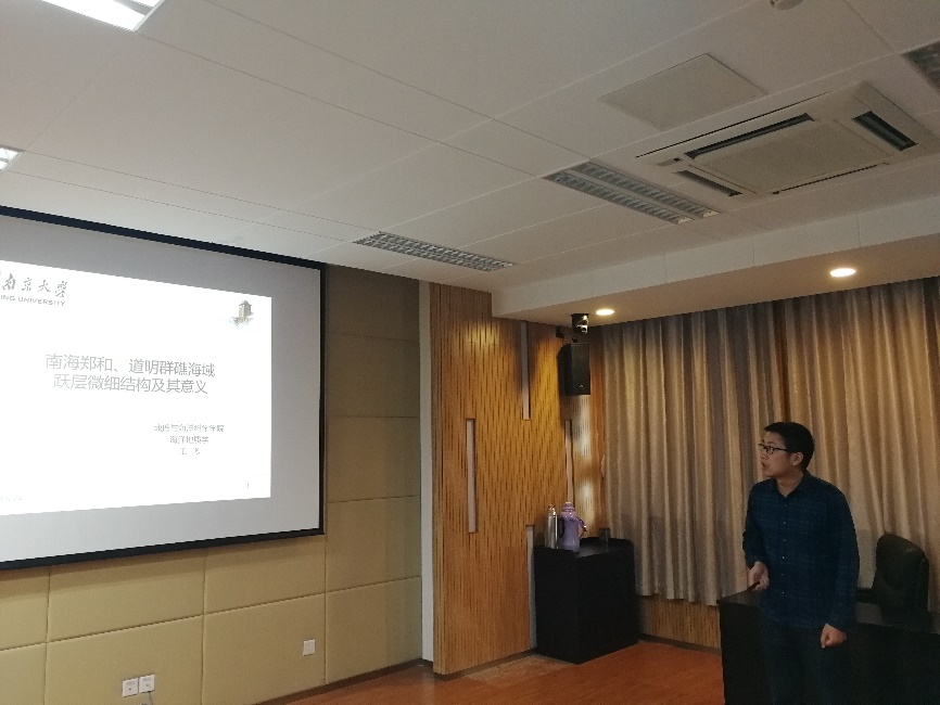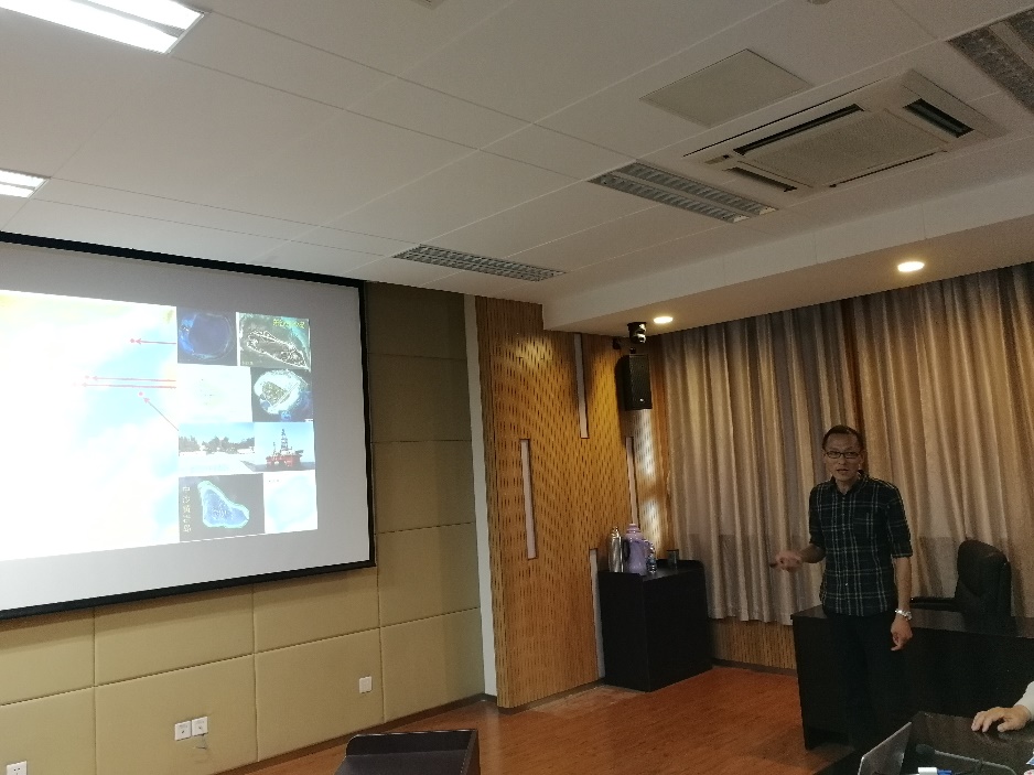 国际视野的重要性。张永战副教授报告了“南海岛礁调查与南沙北部礁岛地貌”,展示了南沙海域岛礁分布、控制现状及三次南沙考察调研所做工作,分析了南沙北部礁岛地貌特点及影响因素。刘绍文副教授报告了“南海北部大陆边缘热流分布特征及其构造意义”,结合已有海洋热流数据阐述南海北部陆缘热状态,探讨了南海陆缘热流格局及机制问题。博士生李亚丽报告了“基于西沙永乐环礁表层沉积物粒径分析的年代标尺及其对珊瑚岛屿沉积物供应的启示”,通过分析西沙永乐环礁表层珊瑚碎屑组分粒径和年代的关系,构建粒径-年代关系模型,讨论了模型的应用前景及对珊瑚礁岛屿沉积物供应的启示。博士生郝喆报告了“海岛居民健康长寿的调查研究及拓展—以海南岛为例”,从海南百岁老人的空间分布、生活习性、环境-人体化学元素的关联三方面探究海南省健康长寿现象、解析海南省百岁老人体内化学元素的含量特征及影响因素。硕士生王飞报告了“南海郑和、道明群礁海域跃层微细结构及其意义”,通过分析南海郑和、道明群礁海域13个站点的温度、盐度、声速等数据,讨论了珊瑚环礁海域跃层微细结构中水深、温度与盐度、密度的变化关系。