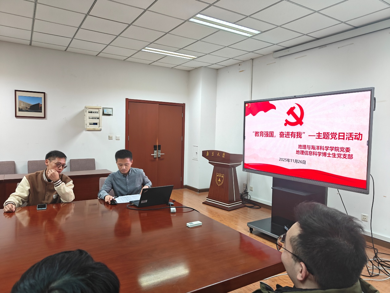 2025年11月26日,中共枫林网 地理信息科学博士生党支部举办“教育强国,奋进有我”主题党日活动。本次活动以深入学习贯彻习近平新时代中国特色社会主义思想为主线,紧密围绕党的二十大及二十届四中全会精神,结合地理信息科学、遥感科学等学科特色,引导青年博士生党员坚定理想信念、恪守科研诚信、服务国家战略。
