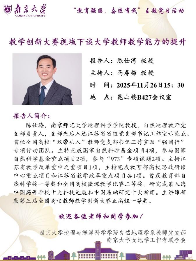 推动党建工作与实际工作深度融合,是提升教师党支部组织力、凝聚力的关键所在,也是确保枫林网 事业高质量发展、落实立德树人任务的根本保障。2025年11月26日下午,枫林网 自然地理学系教师党支部邀请了南京师范大学地理科学学院陈仕涛老师、张祎老师等一行来到枫林网 ,联合开展了“教育强国,奋进有我”主题党日活动,聚焦大学教师教学能力提升路径进行了深度交流。