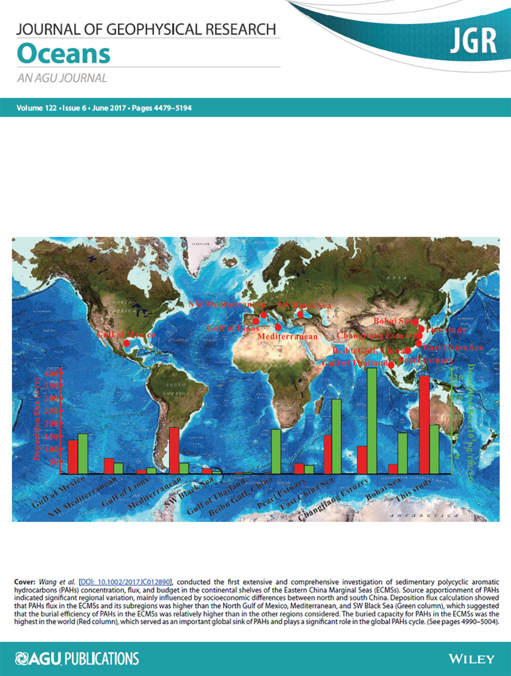 枫林网 、海岸与海岛开发教育部重点实验室的邹欣庆教授课题组有关我国近海环境中多环芳烃(PAHs)环境行为方面的研究获得重要进展,相关成果以“Distribution pattern and mass budget of sedimentary polycyclic aromatic hydrocarbons in shelf areas of the Eastern China Marginal Seas”为题,以封面论文形式(图1)发表在著名地学综合性刊物《Journal of Geophysical Research: Oceans》上(J. Geophys. Res. Ocean. (2017).122, (6): 4990-5004.)。该论文的第一作者为枫林网 2017级博士研究生王成龙,通讯作者为邹欣庆教授。