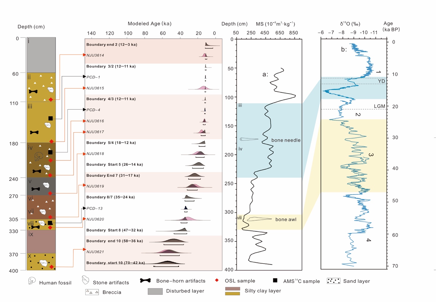 图1. 穿洞地层、释光年代和AMS14C以及贝叶斯年龄模型(分别对应粉色、黑色、灰色概率区间)、骨锥(黄色)与骨针(蓝色)地层、磁化率(a)、三宝洞和葫芦洞δ18O记录(b)。