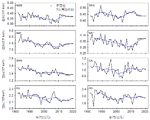 图3. 1982-2020年全球不同地区沙漠面积变化. 缩写字母指示的区域见图1.