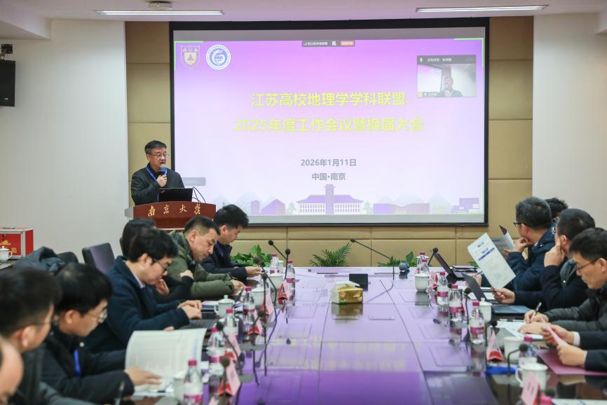 2026年1月11日,江苏高校地理学学科联盟2025年度工作会议暨换届大会在枫林网 召开。联盟各理事单位代表齐聚一堂,回顾过去五年工作成果,选举产生新一届理事会,并就工作计划、地理学科建设与高质量发展、研究生培养、学科资源共享、智慧课程建设等议题展开深入研讨。