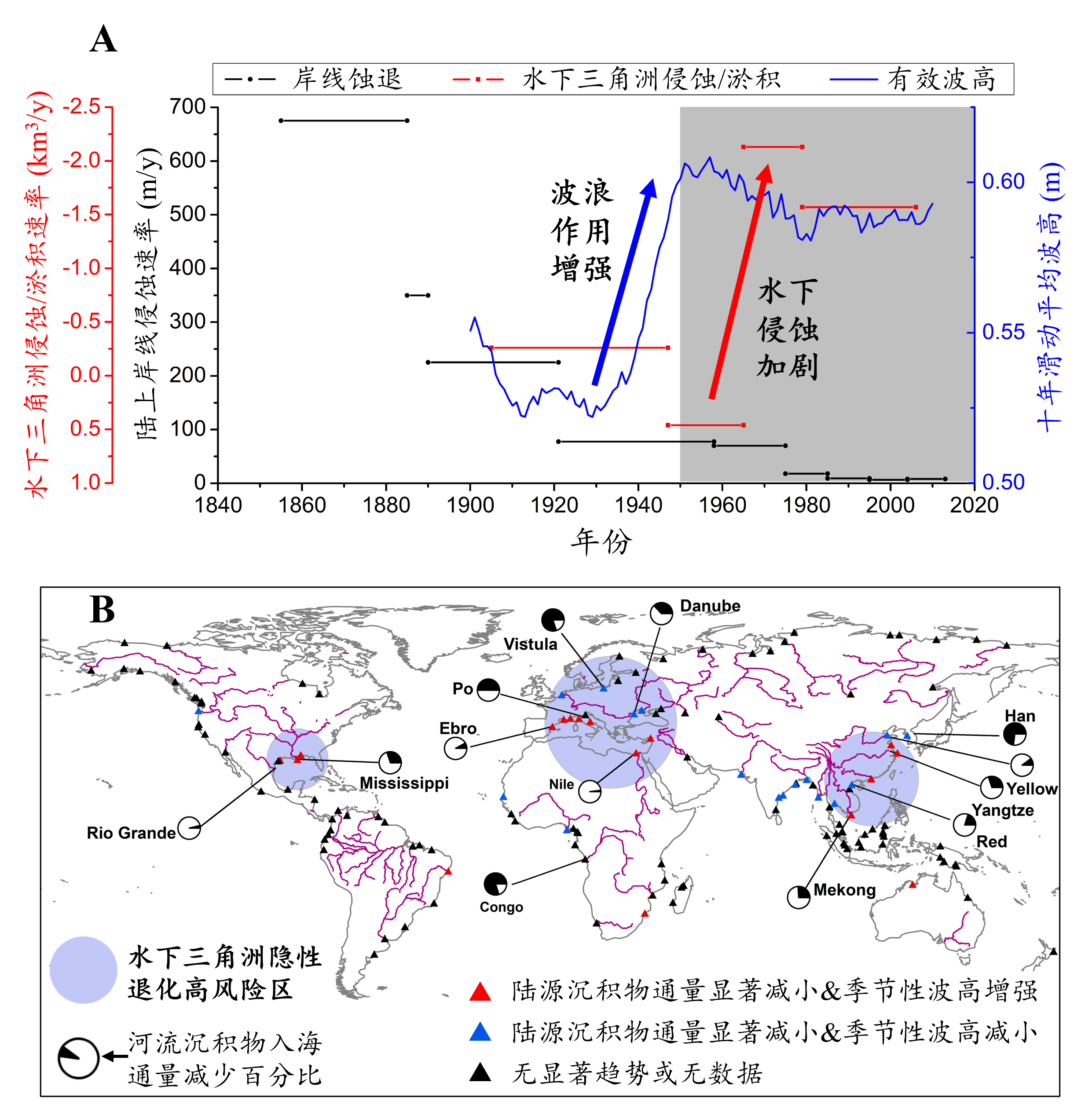 图2. (A)废黄河三角洲物源断绝后近百年来的地貌演化过程和(B)全球水下三角洲侵蚀风险分布预测。