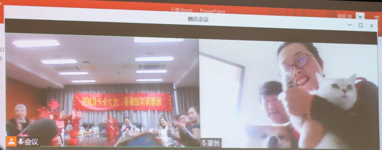 随后,留校学生们依次发言,其乐融融,老师们热切关怀了家在西安、河南等地的同学,并为同学们送上新年祝福。17级博士生陆福志谈及自己高考的故事以及多次在校过年的经历,感谢学院领导及老师对学生留校过年期间的贴心关怀。本科生高滢的家乡在新疆伊宁,今年因疫情无法回家过年,这也是她第一次在外地过年。高滢的父母在线收看了活动直播,在现场连线环节中,她的父母一再对学校、学院给予女儿的关心表示感激,并给在场的同学们都送上了真切的新年祝福。