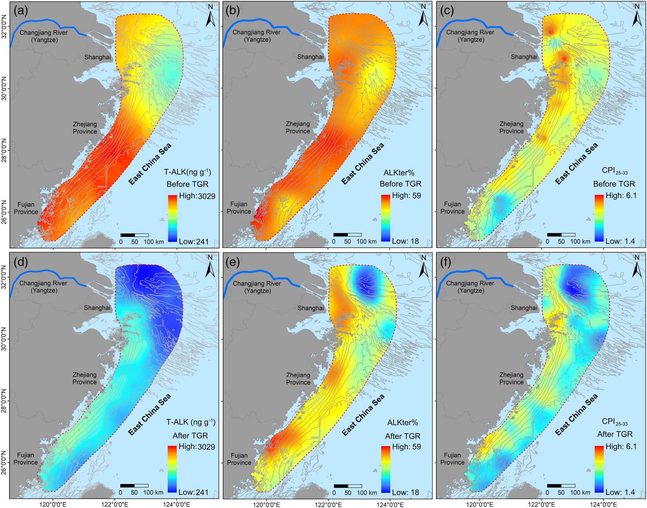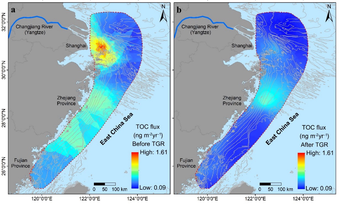 我国东海属于典型的受大河影响的陆架边缘海,长江每年向其输送大量颗粒有机质。巨量陆源物质入海后在长江河口-陆架区形成典型的泥质沉积体,为颗粒有机质提供了良好的埋藏场所。随着流域工程活动不断加剧,长江入海泥沙通量显著减少,并导致长江河口-陆架区的底床沉积物发生再分配,从而可能影响颗粒有机质的输运和沉积过程。枫林网 邹欣庆教授团队,围绕这一问题,开展了全面深入的研究,取得了一系列新进展。近期,他们在国外重要学术刊物Geophysical Research Letters, Water Research, Journal of Geophysical Research: Oceans等发表多篇论文,论证流域工程影响下长江河口-陆架区沉积有机质的时空分布变化及其响应机制。