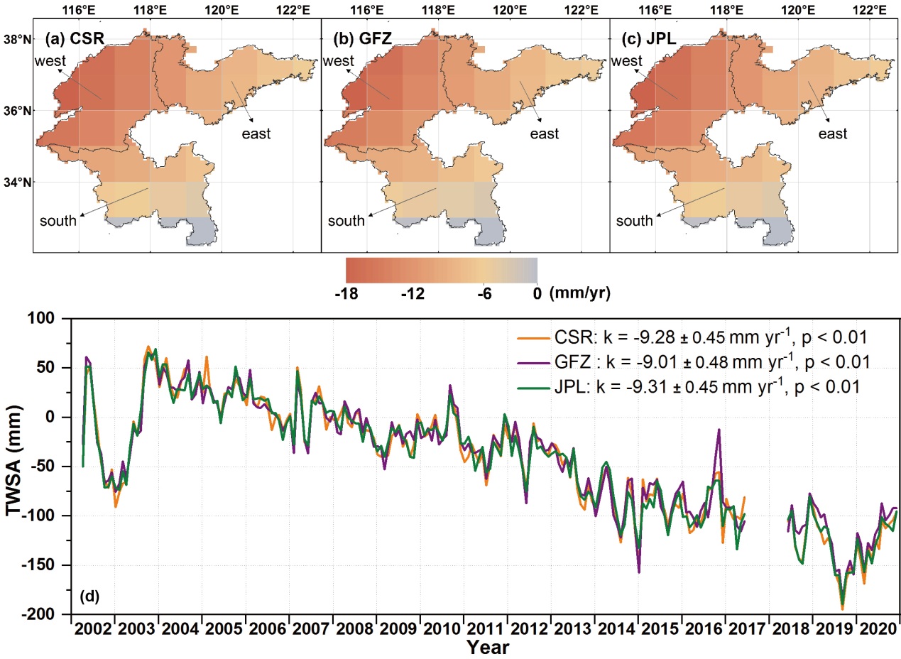 南水北调东线工程受水区是中国重要的粮食生产基地和制造业基地,但是受限于地表水资源的匮乏,该地区大量地下水被抽取从而引发了严峻的水资源问题。同时,快速的城市化发展进程导致生活用水日益增长,使得用水安全成为亟待解决的问题。近年来,大量研究基于南水北调中线工程受水区(华北平原)进行探索,细致的分析了华北平原水资源问题的状况并提出了解决方案。然而针对东线工程受水区的研究不够全面,大多数研究只涉及到受水区部分区域,没有完整的研究该地区陆地水储量变化情况,为该地区水资源管理方案的合理制定以及南水北调东线工程年调引水量的实施计划增加了挑战。此外,从2013年底南水北调东线一期工程启动调水到目前为止,调引水是否解决该地区的水资源问题,是否对当地的地表水蓄水层和地下水蓄水层产生了积极的影响,需要进行详细的调查研究。