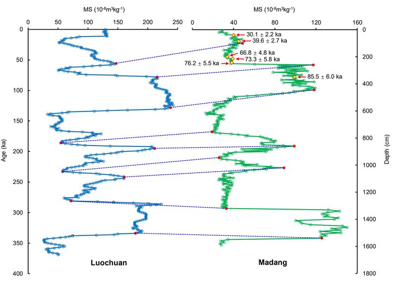 图1低纬马垱剖面与中纬洛川剖面磁化率曲线的对比。红色圆点为地层对比获得的年代标尺控制点,黄色菱形点为光释光样品的位置