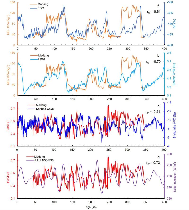 小波分析与频谱分析表明,马垱剖面的磁化率年代序列呈现10万年的变化周期,与全球冰量的主导周期一致;而FeD/FeT(游离铁与全铁的比值)年代序列呈现约2万年的变化周期,接近地球轨道参数岁差的周期(图2)。FeD/FeT比值指示土壤化学风化强度,反映了含铁硅酸盐矿物在化学风化过程中释放出来的铁的比例。在年降水量较高的中国南方地区,其在现代表土中的变化具有明显的降水依赖性,显示FeD/FeT可作为反映降水量的代用指标。马垱剖面FeD/FeT记录与三宝洞石笋的氧同位素记录呈负相关,而与南北半球低纬夏季太阳辐射梯度呈显著正相关(图3)。推测岁差变化主导的太阳辐射增强,使得海陆热力差增加,东亚夏季风相应增强,陆地降水增多,促进土壤化学风化作用增强,从而导致土壤中FeD/FeT比值相应增高。