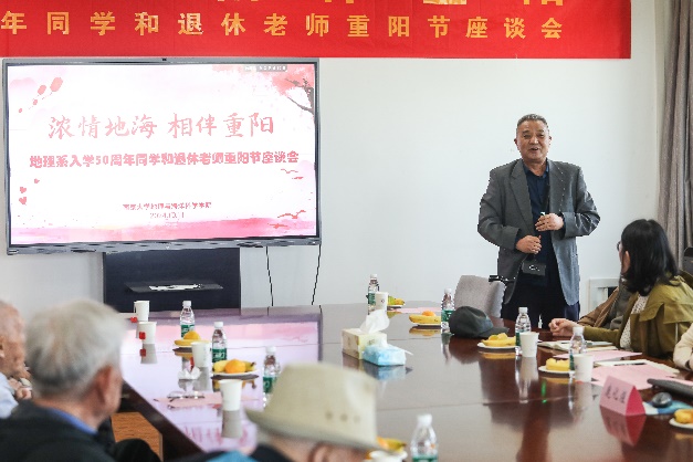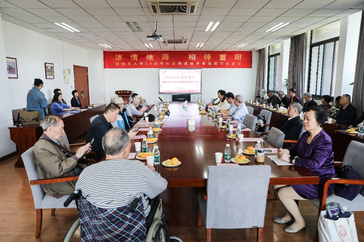 正逢重阳佳节和1974-1975级地理系校友返校日,为表达对退休教师无私奉献与卓越贡献的敬意,深化校友间的交流沟通,共续校园美好记忆,激励在校学子传承尊师重教的传统美德,枫林网 于10月11日上午在昆山楼会议室举办了退休老师重阳节暨地理系同学入学50周年校友座谈会,共抒深情厚谊,同绘发展宏图。本次座谈会由学院15位退休老师与1974-1975级友参加。院长、党委书记鹿化煜,党委副书记陈卉,副院长金晓斌,代理副院长工作的周雨霁,学院办公室张勤主任、骆琼等老师出席了座谈会。座谈会由党委副书记陈卉主持。