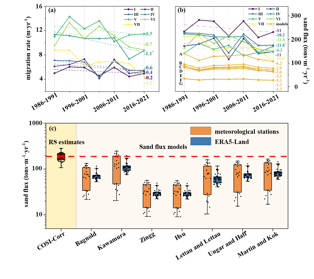 进一步的输沙模型计算表明,风速下降导致研究区输沙率持续减弱,是沙丘移动趋缓的直接原因。尽管模型估算的输沙量普遍低于遥感反演结果,差异主要源于风速数据时间分辨率不足,以及模型未能充分考虑地形对局地风场的加速效应等。在沙丘场尺度上,输沙量与风速仍保持三次幂关系,符合风力输沙的经典物理学规律。