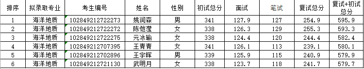 根据《2019枫林网 地海院硕士生复试录取工作细则》,海洋地质专业拟接收报考枫林网 自然地理学专业调剂考生6人,现将拟录取名单公示如下: