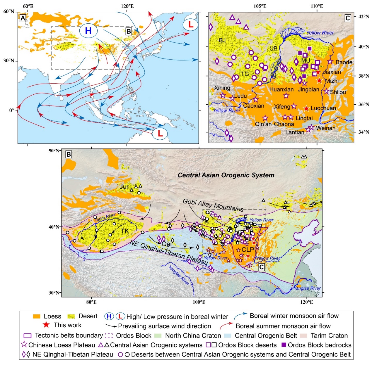 图1. 黄土高原的位置及其与潜在的物源区的联系。其中,橙黄色区域是黄土堆积区。