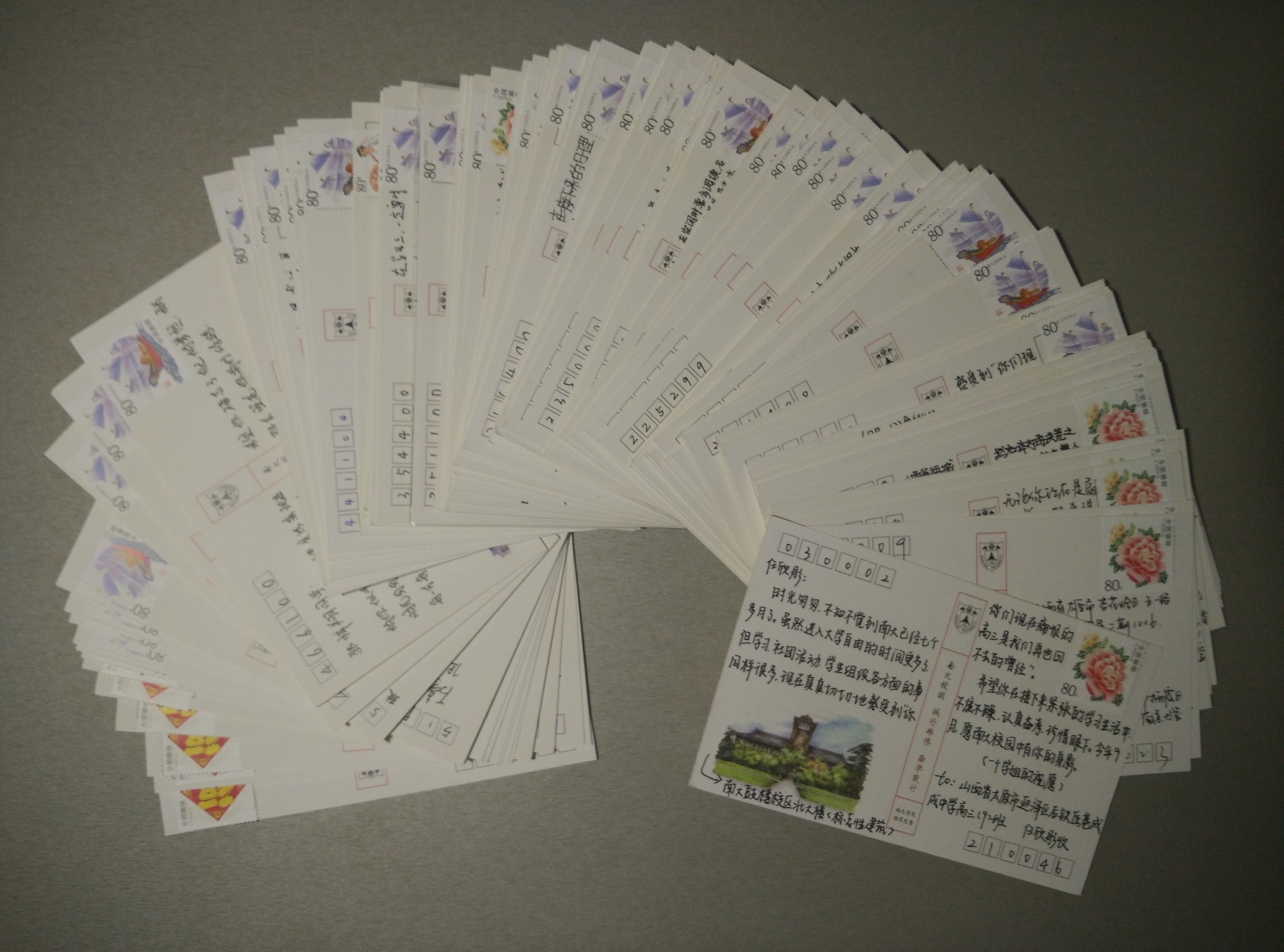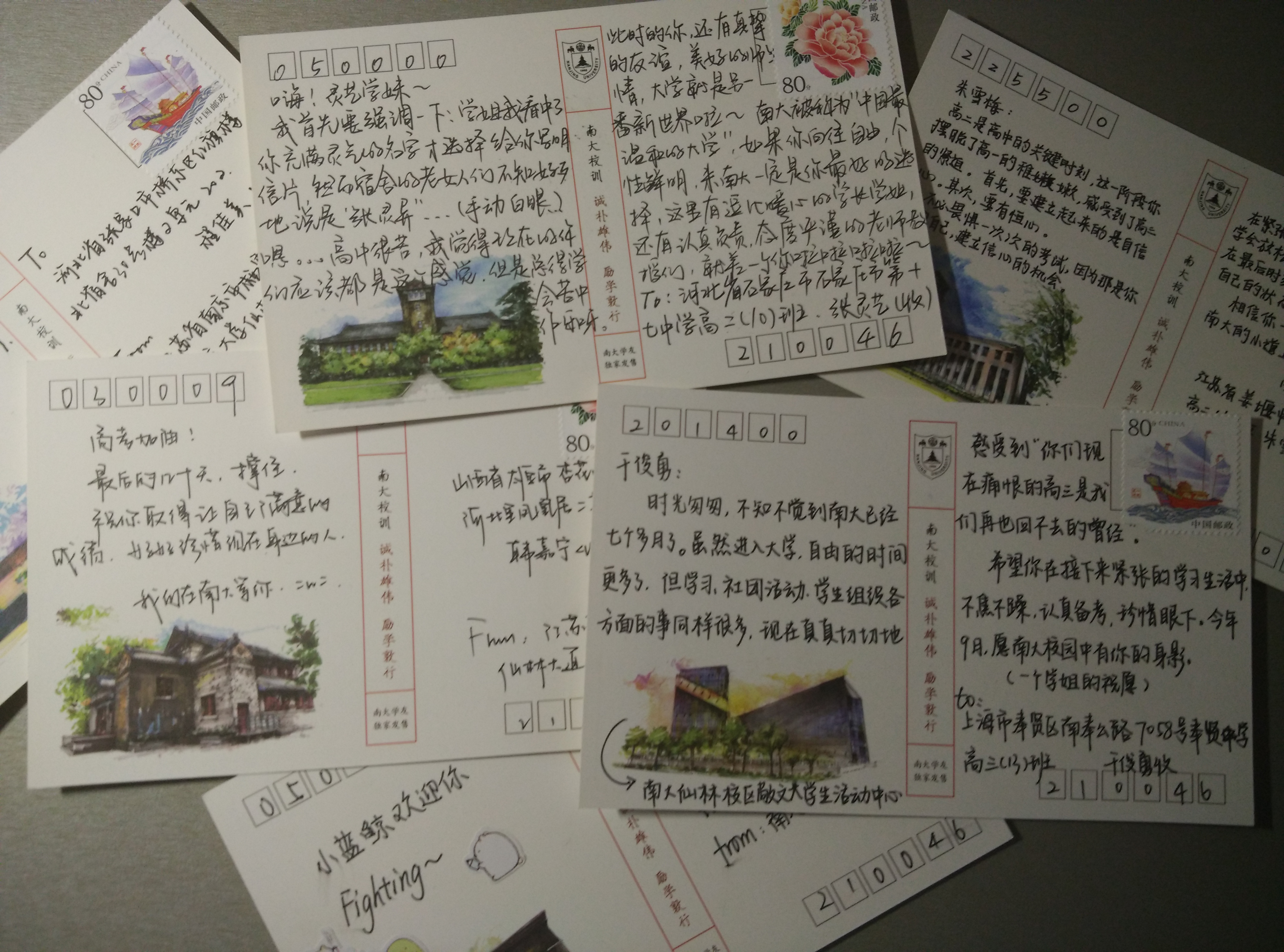 到征集日期截止时,帖子已经被顶到了近300层楼,拥有回复800余条,一度成为南大“热帖”。经统计,我们收到来自全国25个省市自治区170多位初高中同学和7位有志于报考南大研究生的学长学姐的心愿。数量之大,超出了所有活动举办同学的预期,但是,为了不让每一个南大梦留下遗憾,在结束统计工作后,全年级同学迅速积极响应,满怀热血投入到明信片的构写中。5月中旬,近180份明信片已全部从南京大学仙林校区启程,奔赴全国各地,它们携带着85位诚恳真心的同学诚挚衷心的鼓励和祝福去往远方。