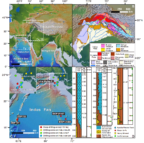 亚洲南部高耸的喜马拉雅-喀喇昆仑山及其南边深陷的阿拉伯海-孟加拉湾,组成了地球表层高程差最大的地形地貌。特殊的地形地貌影响着大气环流型式和大江大河发育,孕育了独有的亚洲季风气候和河流水系格局。长期以来,关于喜马拉雅-喀喇昆仑山脉生长与阿拉伯海-孟加拉湾的形成,吸引着国内外诸多科学家,并取得不少研究进展。然而,关于喜马拉雅-喀喇昆仑山系隆升、印度河演变、阿拉伯海沉积以及季风气候变化等重要科学问题,没有获得一致认识,亚洲南部地貌起源与演变还有诸多不解之谜。最近,我院鹿化煜教授课题组结合在阿拉伯海大洋钻探(ODP)获得的宝贵样品,研究喜马拉雅-喀喇昆仑山与阿拉伯海演变过程,发表了以我院博士生冯晗同学为第一作者的论文“Erosion of the Himalaya-Karakoram recorded by Indus Fan deposits since the Oligocene”, 揭示了亚洲南部山脉-流域的起源和演化,揭示了喜马拉雅-喀喇昆仑山和阿拉伯海体系演变过程,受到同行专家的高度肯定。