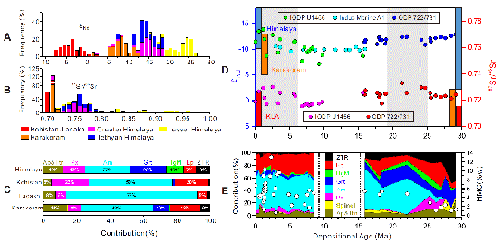 亚洲季风降水侵蚀着喜马拉雅-喀喇昆仑山地表物质,并经印度河传输,沉积到阿拉伯海(图1)。水深超过3000米的阿拉伯海堆积着上千米的沉积物。这些沉积序列是揭示喜马拉雅-喀喇昆仑山生长和侵蚀演化的重要记录。基于这一认识,我院鹿化煜教授、冯晗同学等对采自3000米水下的沉积物进行了仔细研究,测试了沉积物中锆石的铀-铅年龄分布、沉积物全样锶-钕元素同位素值,以及沉积物中磷灰石的裂变径迹年龄并进行了重矿物组合分析(图2, 图3),其中,抗风化强的锆石铀-铅年龄谱和锶-钕元素同位素值可较好指示沉积物的源区,比如,沉积物是来自于喀喇昆仑山、还是喜马拉雅山,并可与重矿物组合对比和互检;磷灰石的年龄可以估计山脉的侵蚀速率、可检验海底沉积物的年代。他们结合前期大洋钻探沉积物序列可靠的年代结果,发现亚洲南部印度河水系格局在渐新世中晚期(老于2700万年)已经形成;从那时开始,喀喇昆仑-喜马拉雅地表被侵蚀的物质通过河流传输,堆积在阿拉伯海甚至于北印度洋,并持续至今,表明亚洲南部的地形和季风气候,那时可能已经初步形成。同时,结合已有的沉积记录和认识,他们发现喜马拉雅-喀喇昆仑山渐新世晚期以来的侵蚀过程主要受到全球气候变化的控制,与物源变化的关系不大。他们从海洋沉积记录研究山脉生长的思路、以及利用深海沉积物堆积稳定、年代准确等优势开展,使得这项研究具有很强的创新性,论文得到了多位审稿人肯定。