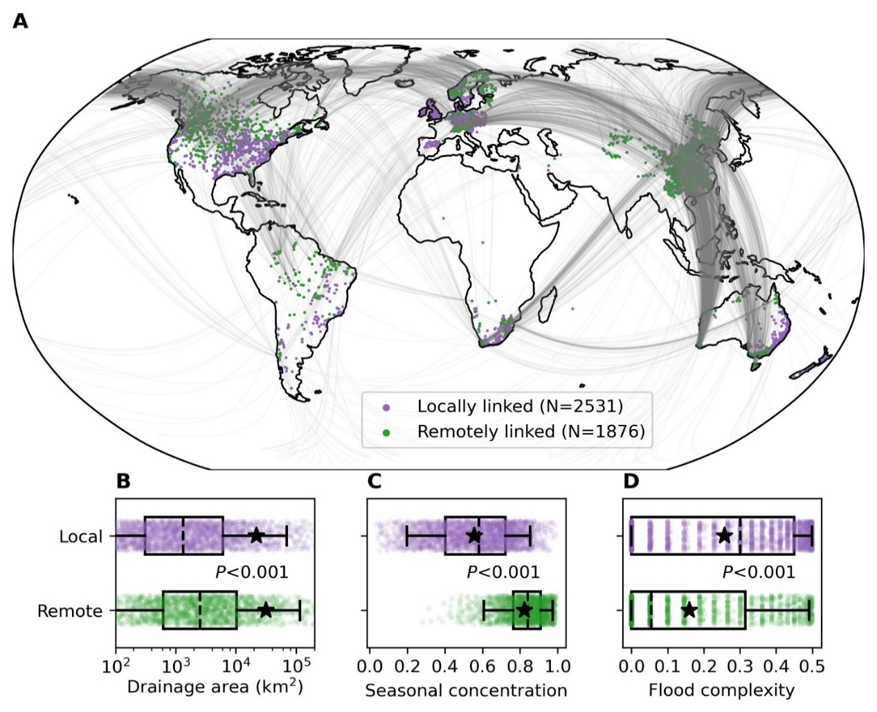 图1 全球流域洪水同步网络。(A)仅发生局地同步(紫色散点)和发生远程同步(绿色散点)的流域空间分布,以及远程同步的流域网络(灰线);局地同步和远程同步流域在流域面积(B)、季节聚集程度(C)以及洪水复杂程度(D)均存在显著差异