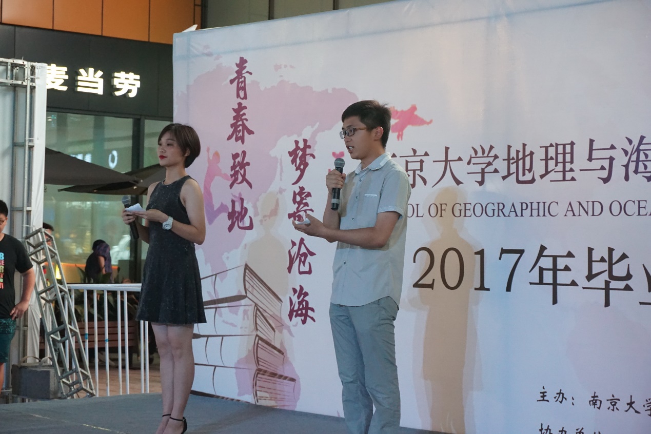 2017年6月11日晚,由我校地理与海洋科学学院2013级和马群招商花园城联合举办的南京大学地理学院2017届本科毕业晚会“青春致地,梦寄沧海”在马群招商花园城1F阳光中庭隆重举行。周寅康老师、地理学院13级辅导员周雨霁老师以及地理学院的众多师生共同参加了晚会。