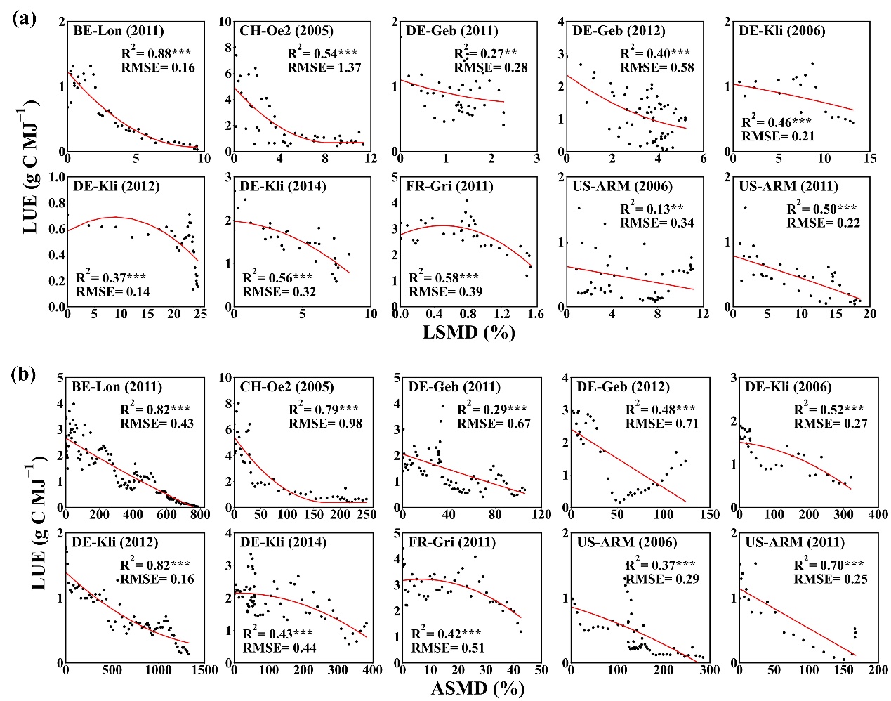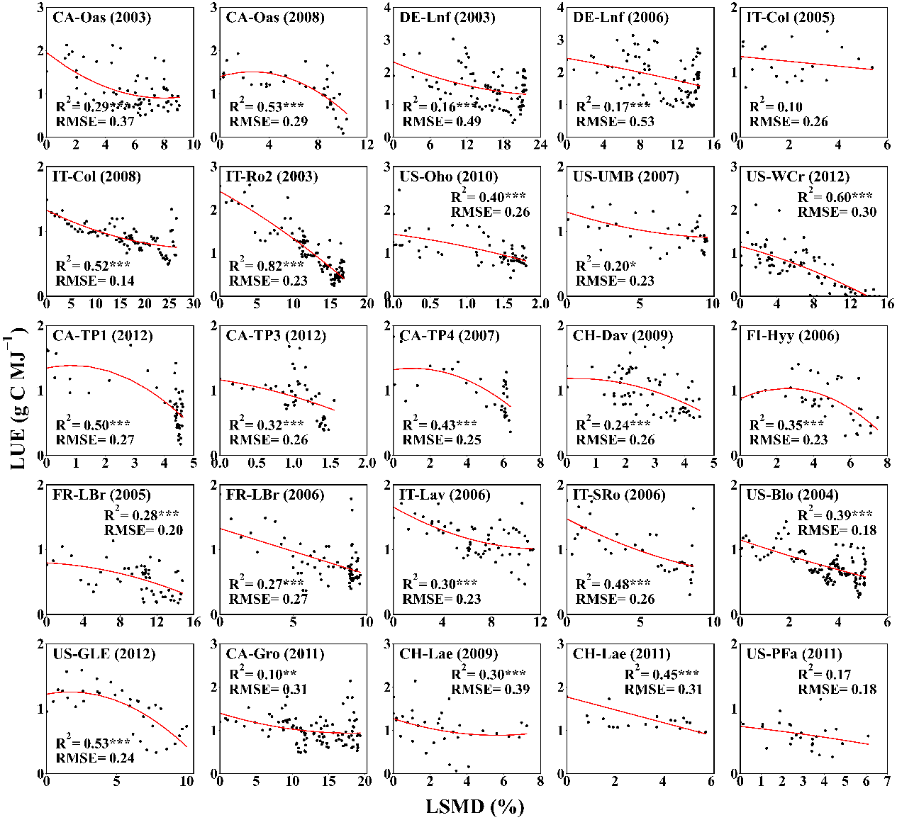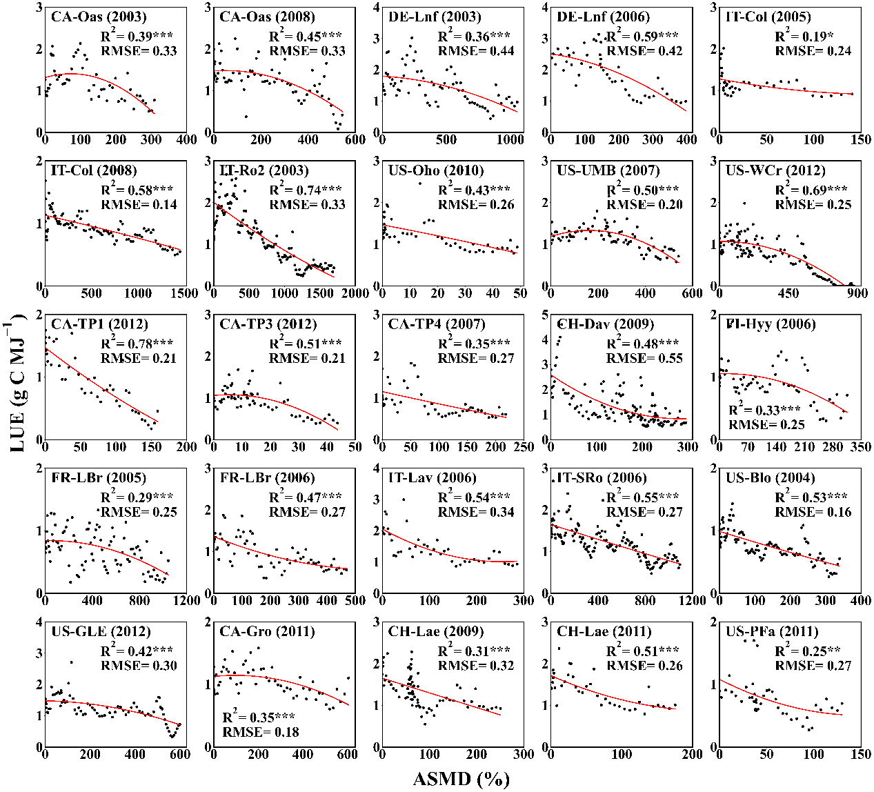 图2 累积土壤水分亏缺与森林LUE的相关性