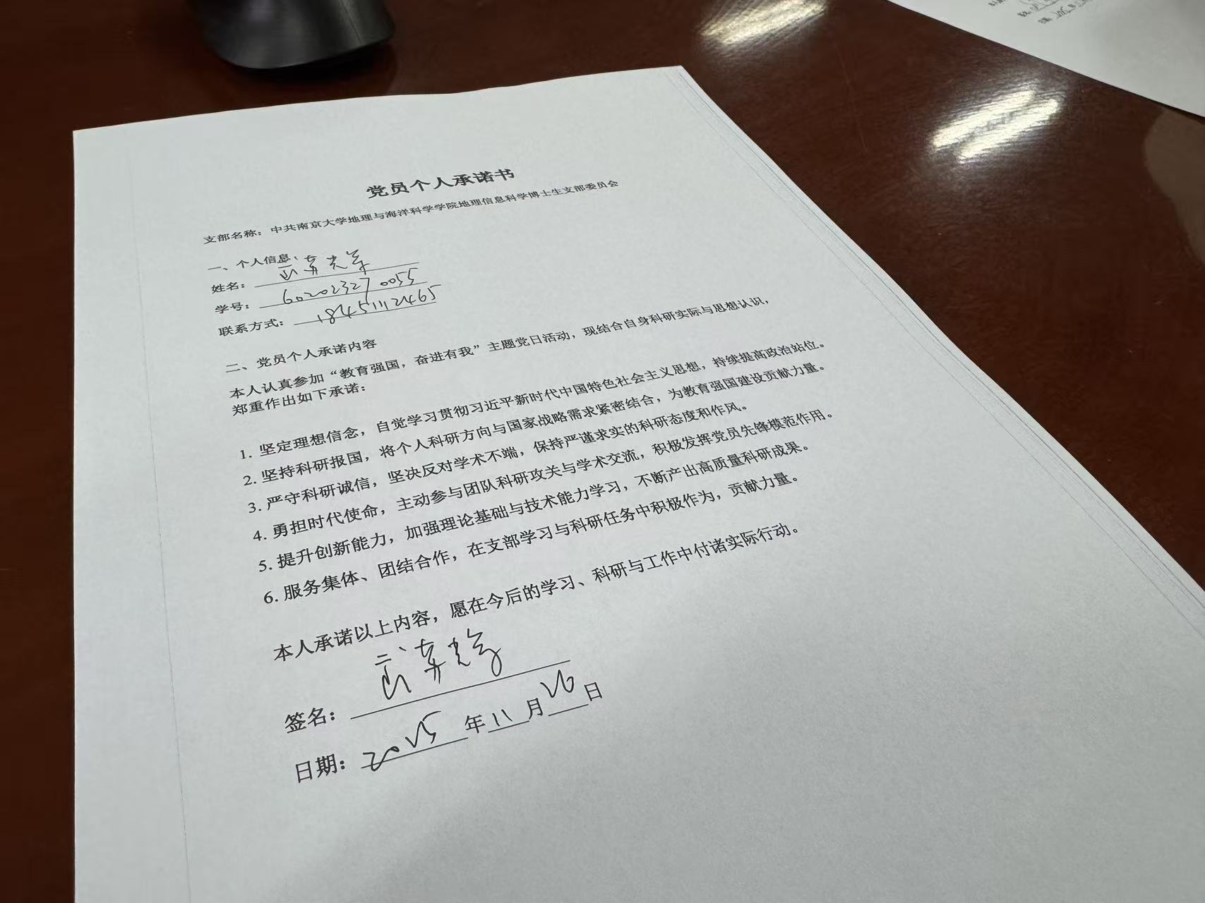 2025年11月26日,中共南京大学地理与海洋科学学院地理信息科学博士生党支部举办“教育强国,奋进有我”主题党日活动。本次活动以深入学习贯彻习近平新时代中国特色社会主义思想为主线,紧密围绕党的二十大及二十届四中全会精神,结合地理信息科学、遥感科学等学科特色,引导青年博士生党员坚定理想信念、恪守科研诚信、服务国家战略。