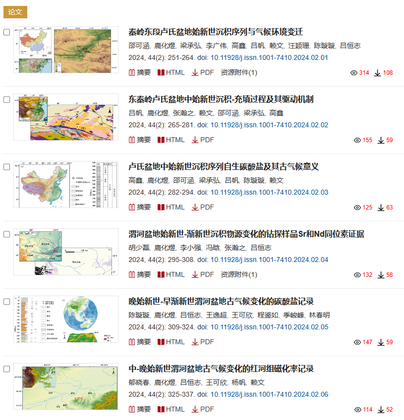 随着全球温度升高,我国的气候、水文、土壤、生态和流域地表物质运动如何响应,是受到关注的重要科学问题。然而,要准确地回答这些问题,仍然有不少困难。在地球气候与环境演化的历史上,曾经出现过多次全球高温时期,那时两极地区并没有冰盖、或者只有南极发育小面积的冰盖,这些气候暖期是认识地表环境特征的重要参考。其中,距今5000-3000万年的始新世-渐新世期间,全球温度高,从两极没有冰盖发展到南极出现冰盖,这段时间是揭示暖期地球环境的最佳“窗口”之一。在我国中部东秦岭地区的渭河盆地、卢氏盆地等,保存着大量的始新世-渐新世沉积物,成为认识暖期我国自然地理环境的重要证据。近日,我院师生围绕暖期东秦岭环境演变规律和机制的科学问题,在权威学术刊物《第四纪研究》发表了6篇论文(图1,图2),阐述他们的新发现。