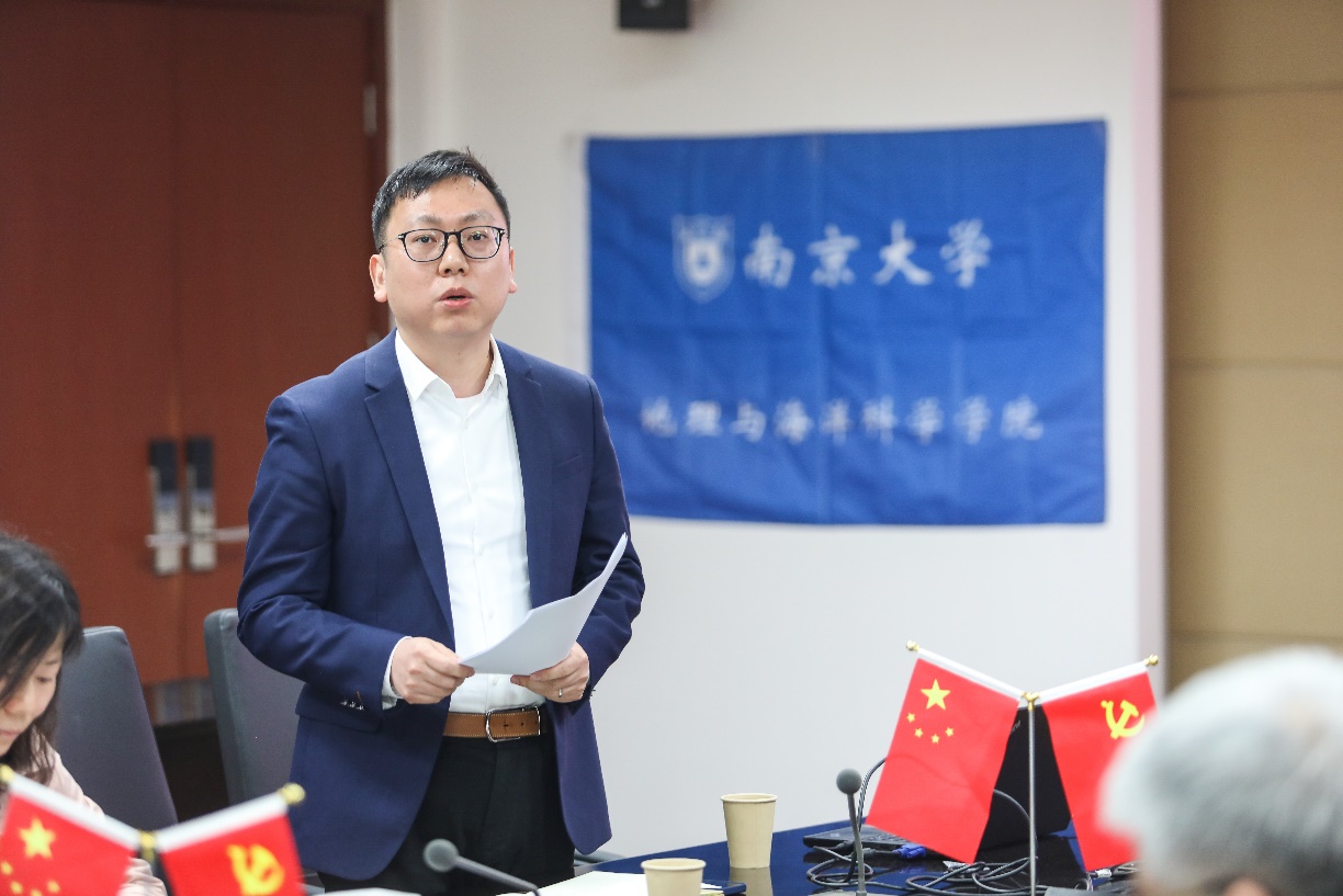 4月12日下午,南京大学地理与海洋科学学院国土资源与旅游学系教师党支部召开党员大会,讨论接收张宏磊副教授为中共预备党员。会议由党支部书记汪侠主持,地理与海洋科学学院党委书记李满春,党委副书记陈卉,党委委员、副院长金晓斌,以及国土资源与旅游学系教师党支部党员参加会议。
