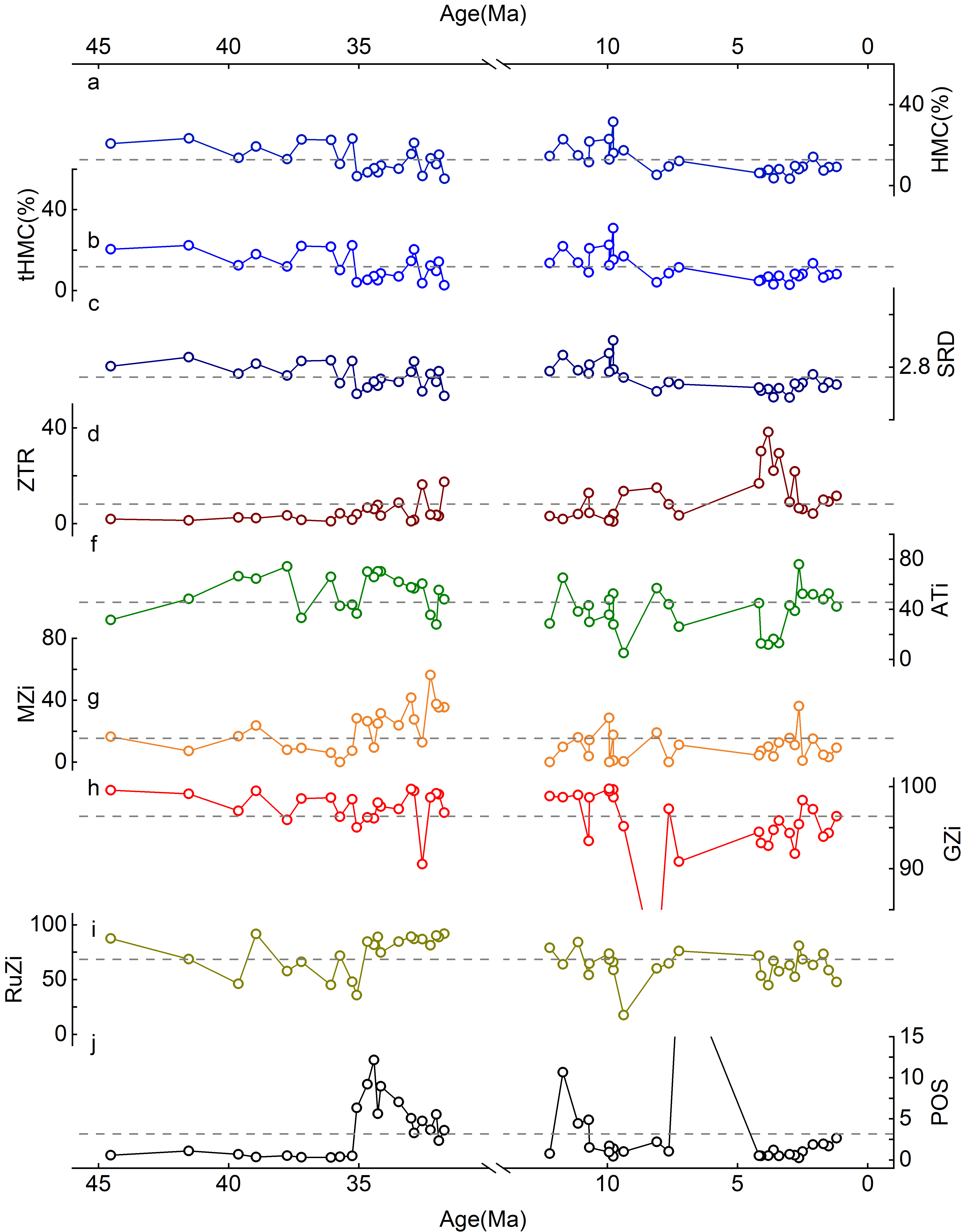 图2 渭河盆地新生代沉积物水力分选指标(HMC, tHMC, SRD)、成熟度指标(ZTR)和物源相关的矿物对指标(ATi, MZi, GZi, RuZi, POS)变化