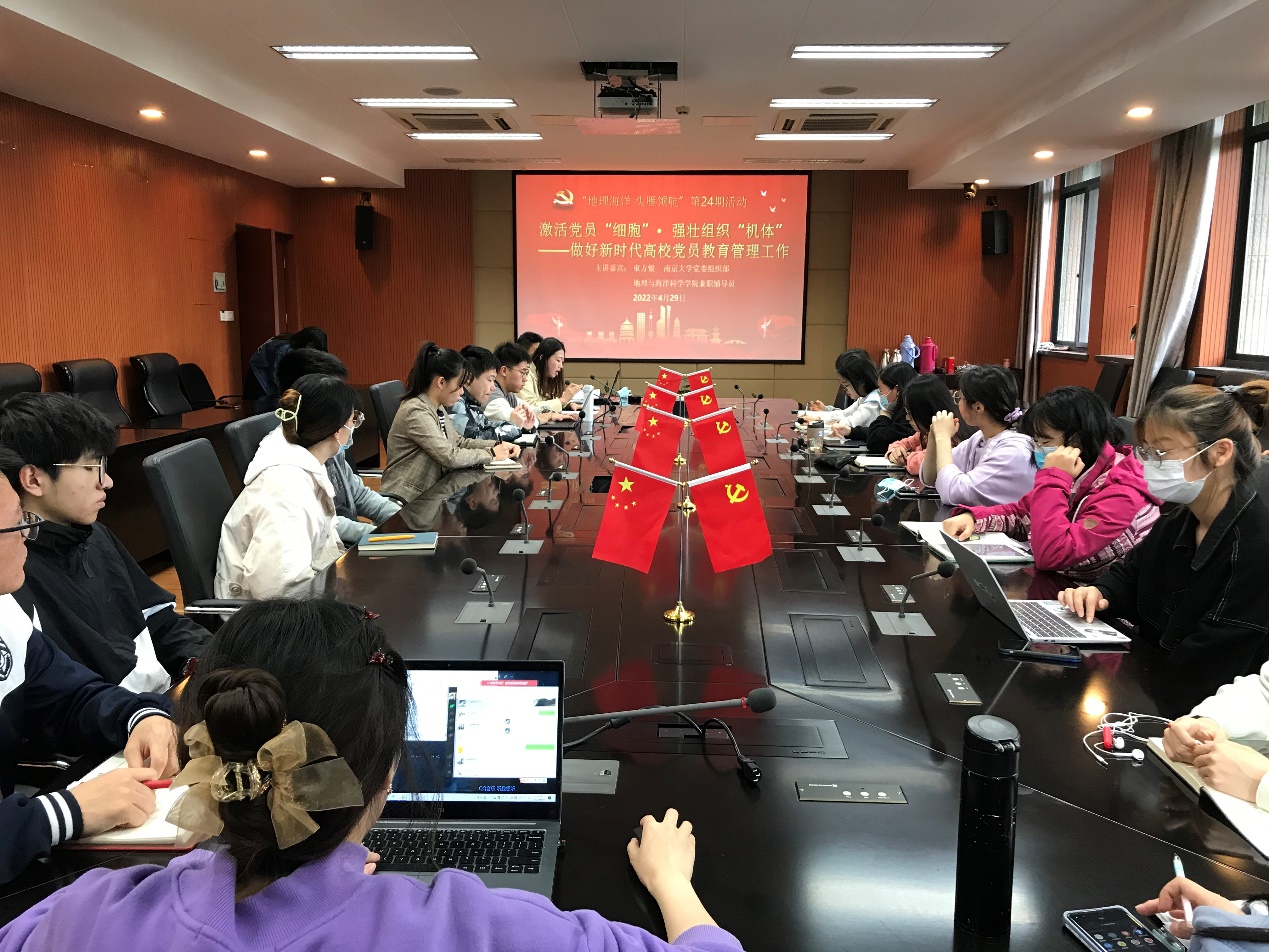 为切实提升高校党员的管理水平与先锋模范作用,推动支部党员教育工作有效开展,4月29日,地理与海洋科学学院党委举办“激活党员细胞,强壮组织肌体”新时代党员教育管理讲座,本次活动为“地理海洋,头雁领航”党员骨干能力提升系列活动的第24场。南京大学党委组织部、地理与海洋科学学院兼职辅导员束方银老师应邀作《激活党员“细胞”,强壮组织“机体”——做好新时代高校党员教育管理工作》主题报告,20硕人文地理党支部书记张金悦主持会议,研究生党支部书记、委员40余人参与本次会议。