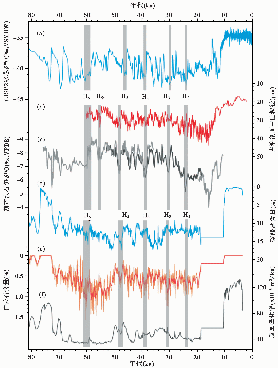 图1. 河南郑州刘家沟剖面(d)碳酸盐含量、(e)白云石含量(橙色为原始数据,红色为5点滑动平均值)、(f)磁化率年代序列及与(a)格陵兰GISP2冰芯氧同位素、(c)南京葫芦洞石笋、(b)甘肃古浪黄土记录对比