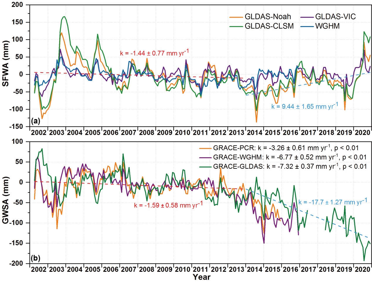 图1 2002年4月至2020年12月南水北调东线一期工程(SNWDP-ER1)受水区地表水(SFWA)和地下水储量变化(GWSA)时间序列。GRACE-PCR(2002-2015)、GRACE-WGHM(2002-2016)和GRACE-GLDAS(2002-2020)的结果分别以黄色、紫色和绿色显示。红色虚线表示P1中GRACE-PCR、GRACE-WGHM和GRACE-GLDAS加权平均值的斜率,蓝色虚线P2中GRACE-GLDAS的斜率。