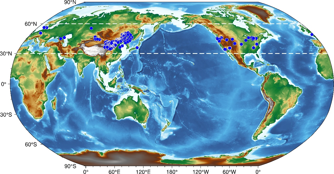 南京大学地理与海洋科学学院联合相关合作单位近期开展了一项研究,尝试利用土壤有机碳同位素指标进行古温度重建,并成功定量了季风边缘区全新世夏季温度和活动积温的变化过程。该研究选择东亚季风边缘区的浑善达克沙地东缘格类河(GLH)砂黄土剖面为研究对象,获得了该剖面全新世δ13Corg的变化结果;并从北半球中纬度地区(30N—60N)筛选出与该剖面相近热量带(限定T 10 C活动积温在1800~4200C·d范围内)的792个表土样点(图1),结合欧洲中期天气预报中心(ECMWF)提供的全球气候第五代大气再分析数据(ERA5),系统分析空间表土样品有机碳同位素与现代温度和降水之间的相关关系。