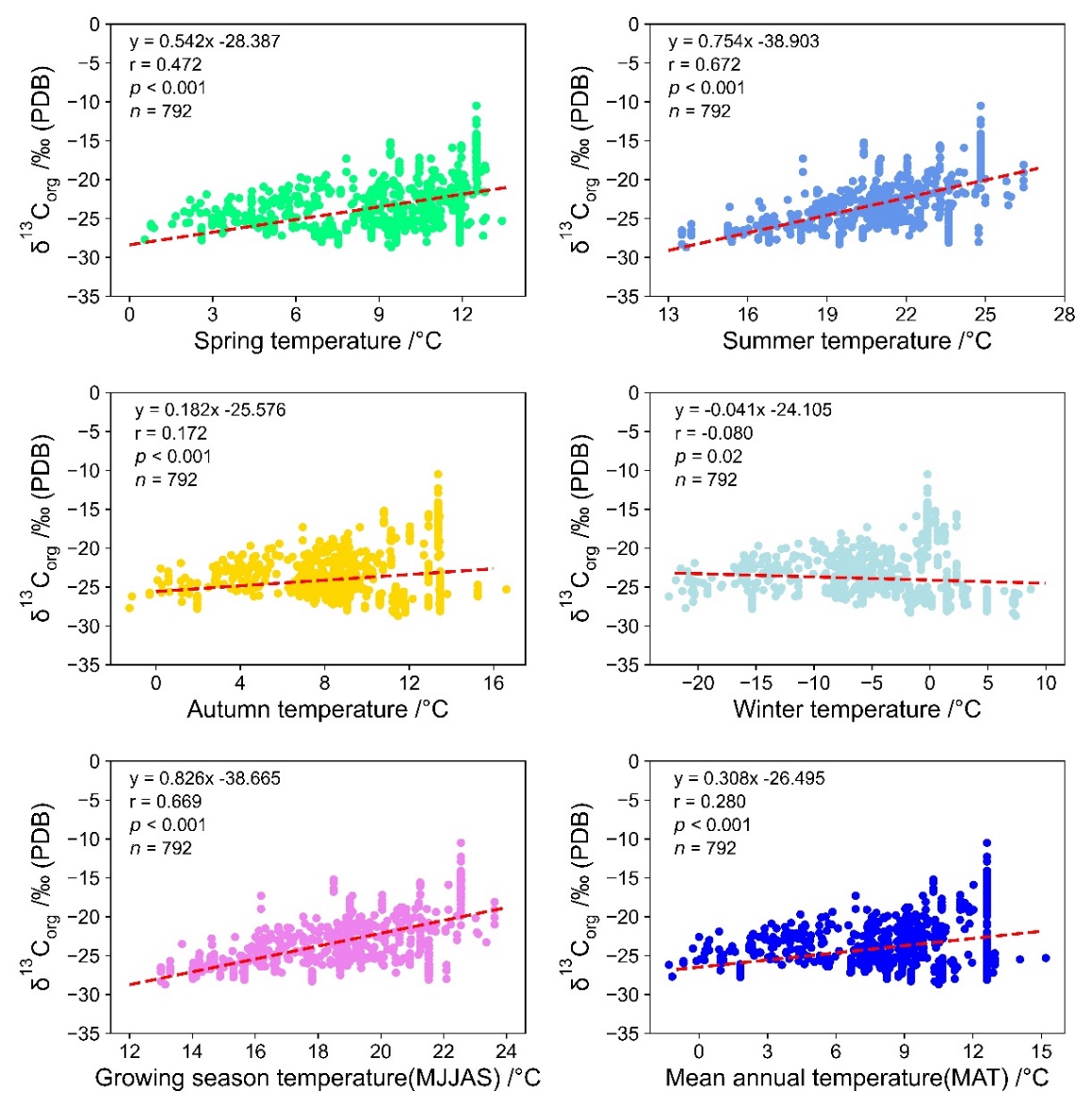 本项研究的分析结果表明:温度(而不是降水)主控下的C3/C4植物丰度变化是导致剖面全新世δ13Corg值变化的主要原因;空间表土δ13Corg与夏季(6–8月,JJA)、生长季温度(5–9月,MJJAS)以及T 0 C、T 10 C活动积温之间均呈强的正相关关系,而与年均温(MAT)相关性较弱(图3)。空间表土δ13Corg与现代平均年降水量(MAP)之间则呈中等程度的负相关关系(r = -0.38,p < 0.001)。GLH剖面中的δ13Corg变化记录了全新世植被组成为C3/C4混合植被,C4植物相对丰度变化于23.40%~1.70%之间。来自空间表土现代过程和剖面指标变化特征的综合证据一致证实,暖季温度是驱动GLH剖面中δ13Corg值变化的主控因素,为全新世季节温度和活动积温的定量重建奠定了基础。