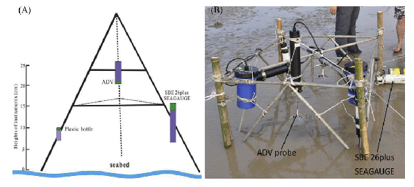 汪亚平教授课题组运用高精度、高时空分辨率的自容式水动力-沉积物-地貌联合观测系统(如图1),结合波流边界层模型,进行了潮滩沉积物可侵蚀性的定量化精细研究,发现潮滩次表层沉积物比表层沉积物更稳定。换言之,相对于表层沉积物来说,次表层沉积物更不易侵蚀。其原因不是次表层沉积物比表层沉积物粗,而是由于次表层沉积物由于固化作用导致含水率比表层沉积物低,因而更加稳定。此发现的科学意义在于可利用现场观测系统来确定浅海的近底部临界切应力、可侵蚀性等关键物理参数,并证明在沉积地层学模拟中需设置不同层序的临界值,从而提高地貌演化和沉积地层的模拟能力,准确预测浅海的沉积地貌演化和环境变化,海岸演化规律,有助于制定科学的海岸防护政策。