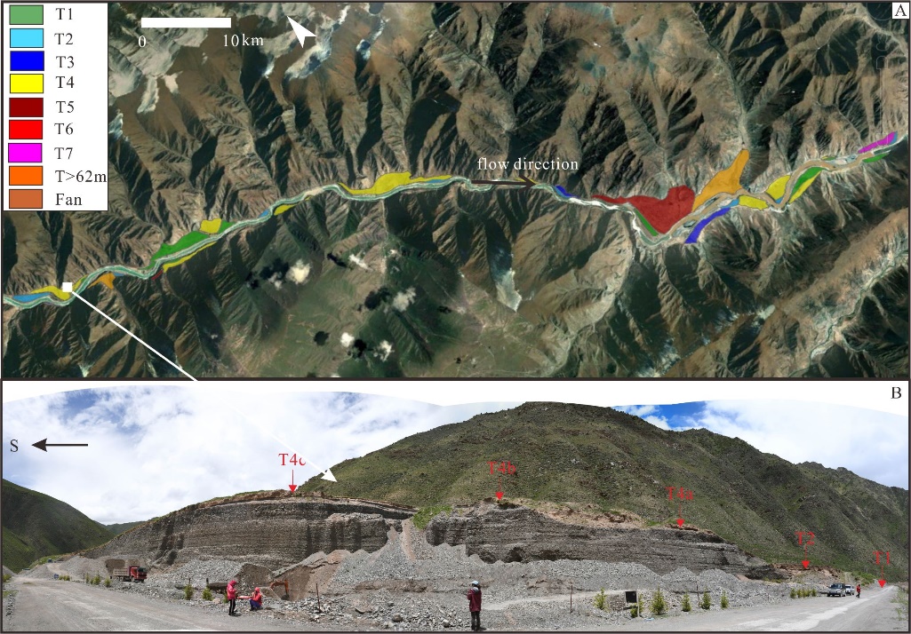 最近,我院教授王先彦和博士生于洋等在长江源通天河开展了河流地貌过程的研究,取得了重要进展,相关研究结果发表在国际知名学术刊物《GSA Bulletin》上。该课题组通过对通天河流域不同构造背景区河流阶地(图2)、沉积过程和光释光年代的详细对比研究,发现强烈的构造活动和极端的坡地过程等,导致峡谷区和盆地区河谷在末次盛冰期同时快速堆积和侧向拓展(侵蚀),形成超过60 m厚层堆积;在末次冰消期,季风逐渐增强时期,河流下切形成多级堆积阶地(图3)。