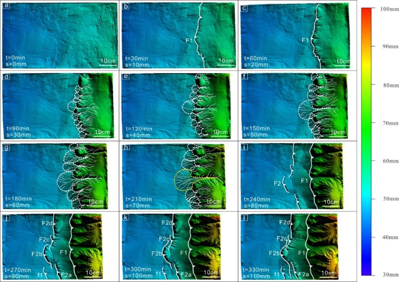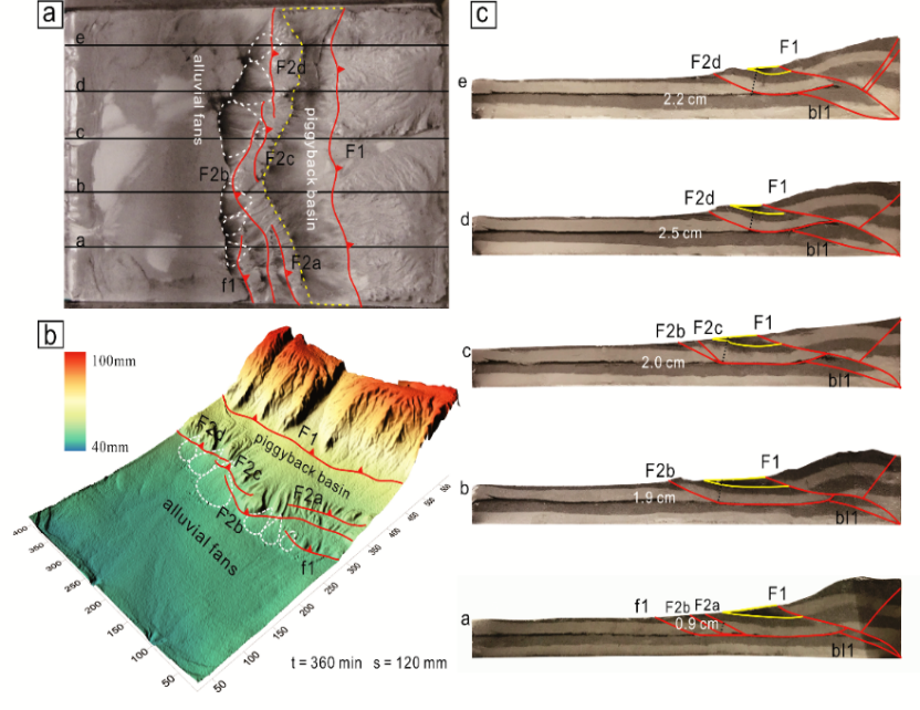 先前研究大多基于构造几何学、气候和地貌的综合分析推断其形成过程,缺乏构造地貌的动态演化过程和机制的探讨,而模拟能够为这一问题的解决提供必要途径。最近,我院李一泉副教授和硕士生毛宇琼等通过构造地貌物理模拟实验,采用水饱和的材料,为更精细尺度的地表过程作用下褶皱冲断带的演化提供了新的视角(图1,2)。该研究设计了多组物理模拟实验,通过三维扫描仪获取地貌的动态演化过程,定量探讨了有无塑性滑脱层和不同地壳缩短速率下,褶皱冲断带地表过程对构造缩短的响应及其对构造发育的影响。相关研究结果发表在国际知名学术刊物《Tectonics》上。