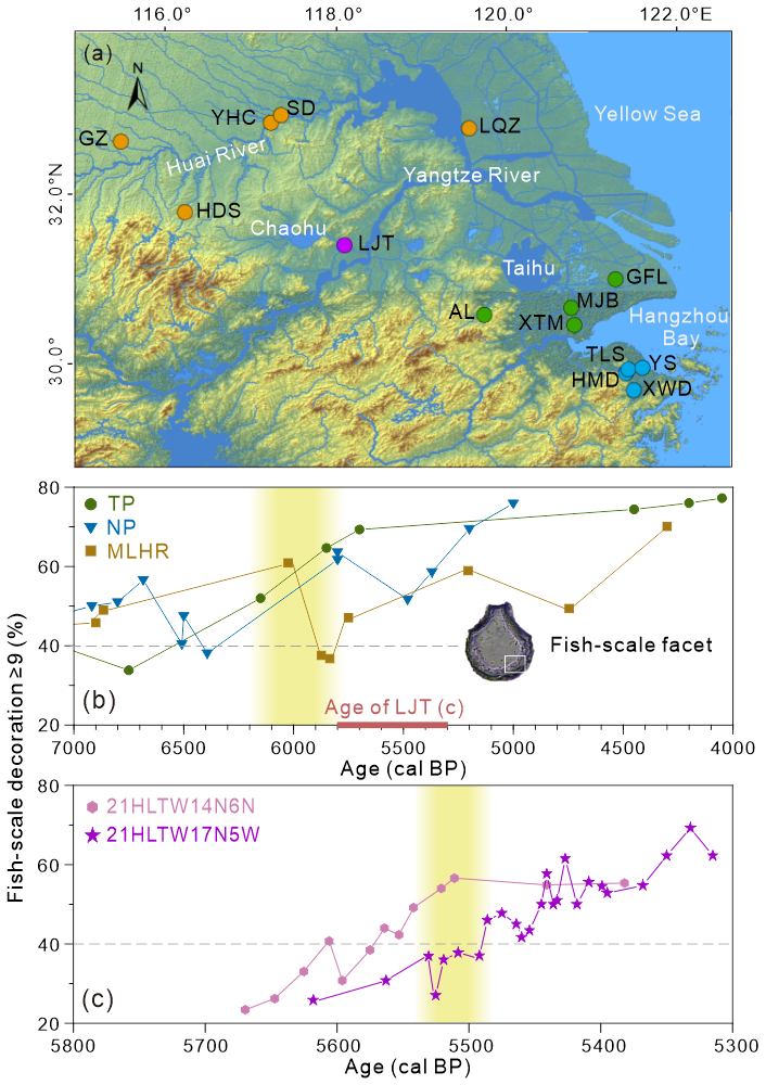 图2 中国东部地区中全新世水稻驯化的遗址点分布(a),长江下游和淮河中下游地区遗址点记录的水稻扇型(≥9)的百分比(b),巢湖地区凌家滩遗址水稻扇型(≥9)的百分比(c).