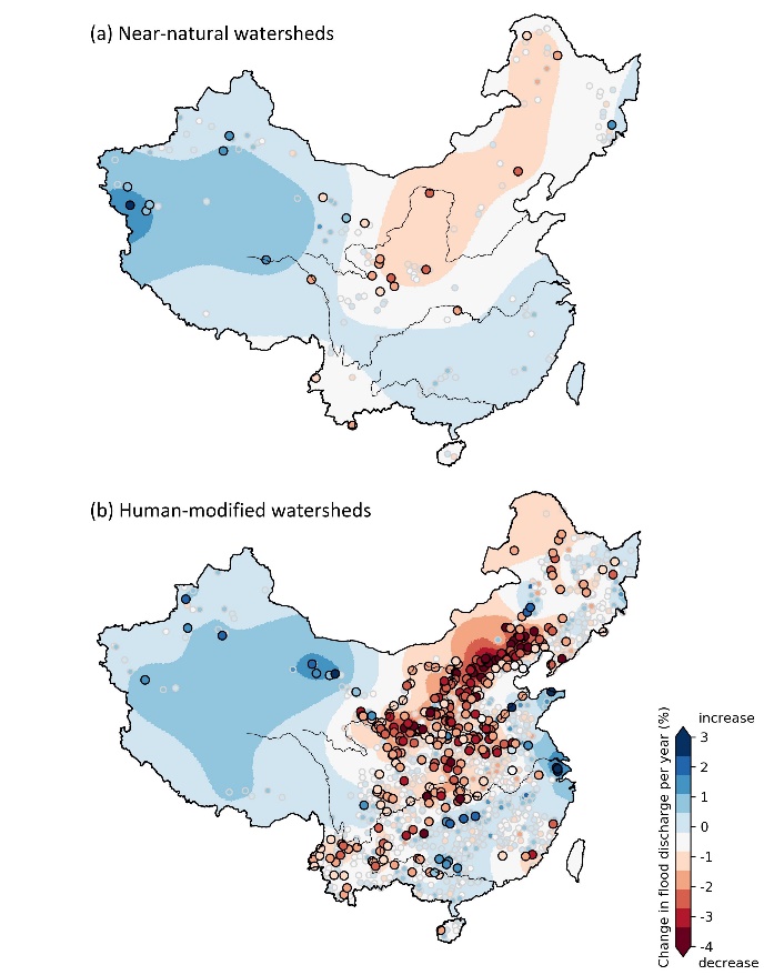 近日,我院杨龙副教授课题组在《地球物理研究快报》(Geophysical Research Letters)上发表文章(论文链接://doi.org/10.1029/2021GL093061),研究发现气候变化是导致我国流域洪水量级发生变化的主要原因,从全国范围来看水利工程和土地管理措施对年最大洪峰量级变化的影响并不显著(图1)。该研究整理汇编了1980-2017年我国1617个流域的年最大洪峰系列,开发了包含水利工程设施分布及土地利用变化的中国水文地理数据集,在此基础上,首次全面揭示了近40年我国流域洪水的时空变化特征。