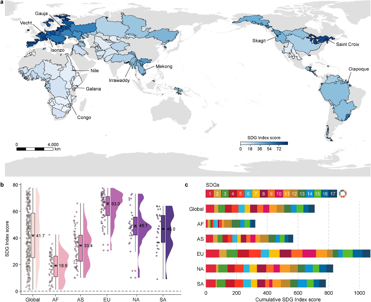 跨国界流域承载着全球40%以上的人口和淡水供应,是实现联合国可持续发展目标(Sustainable Development Goals, SDGs)的关键区域,却长期面临水资源分配不均、生态环境脆弱及跨国治理复杂等多重挑战。本研究首次在全球尺度上定量揭示了跨界流域可持续发展存在的显著差距:其平均SDG指数仅为42分,远低于国家层面的平均水平(67分),且区域差异显著。非洲跨界流域整体表现较弱,欧洲虽整体较高,但在水生资源保护(SDG 14)方面仍存在明显短板。清洁饮水和卫生设施(SDG 6)成为全球跨界流域最亟需改善的核心目标(图1)。